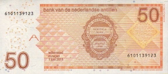 Ten banknot pochodzi z ostatniej emisji Antyli Holenderskich przed rozwiązaniem tego terytorium w 2010 roku. Curaçao, widoczne na awersie, stało się wówczas osobnym bytem autonomicznym w Królestwie Niderlandów. Banknoty te pozostały w obiegu do czasu wprowadzenia lokalnych walut dla Curaçao i Sint Maarten.